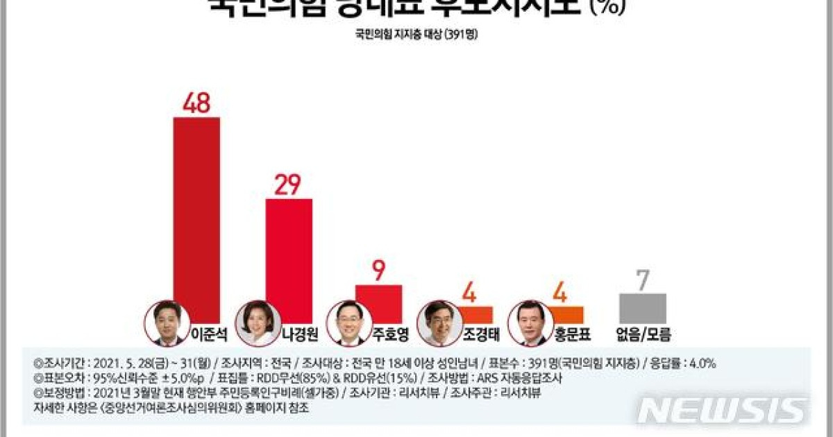 이준석 당대표 지지율 48.2%…16.9% 나경원 '압도'.